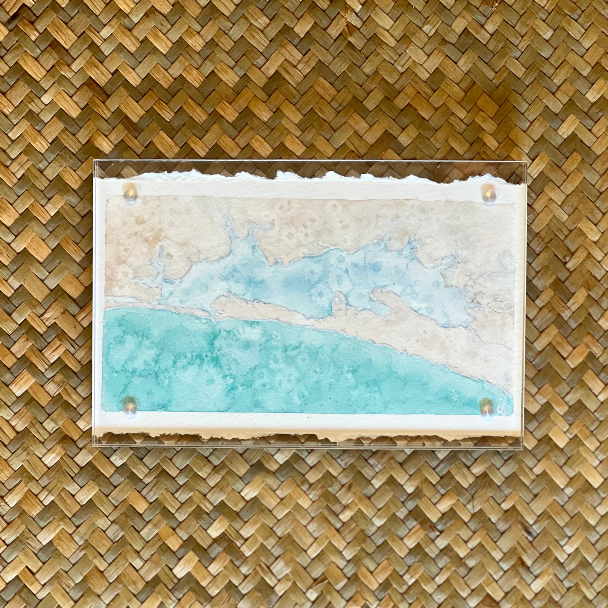 Watercolor coastal map artwork on hand torn paper is set in an acrylic 4” x 6” tabletop frame.