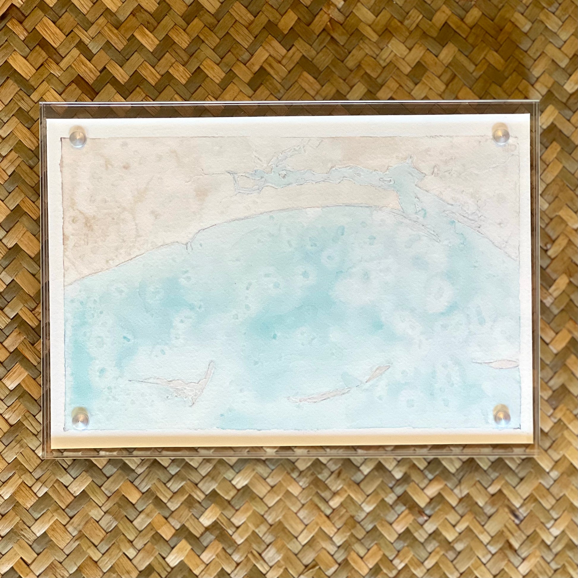 Watercolor coastal map artwork on hand torn paper is set in an acrylic 4” x 6” tabletop frame.
