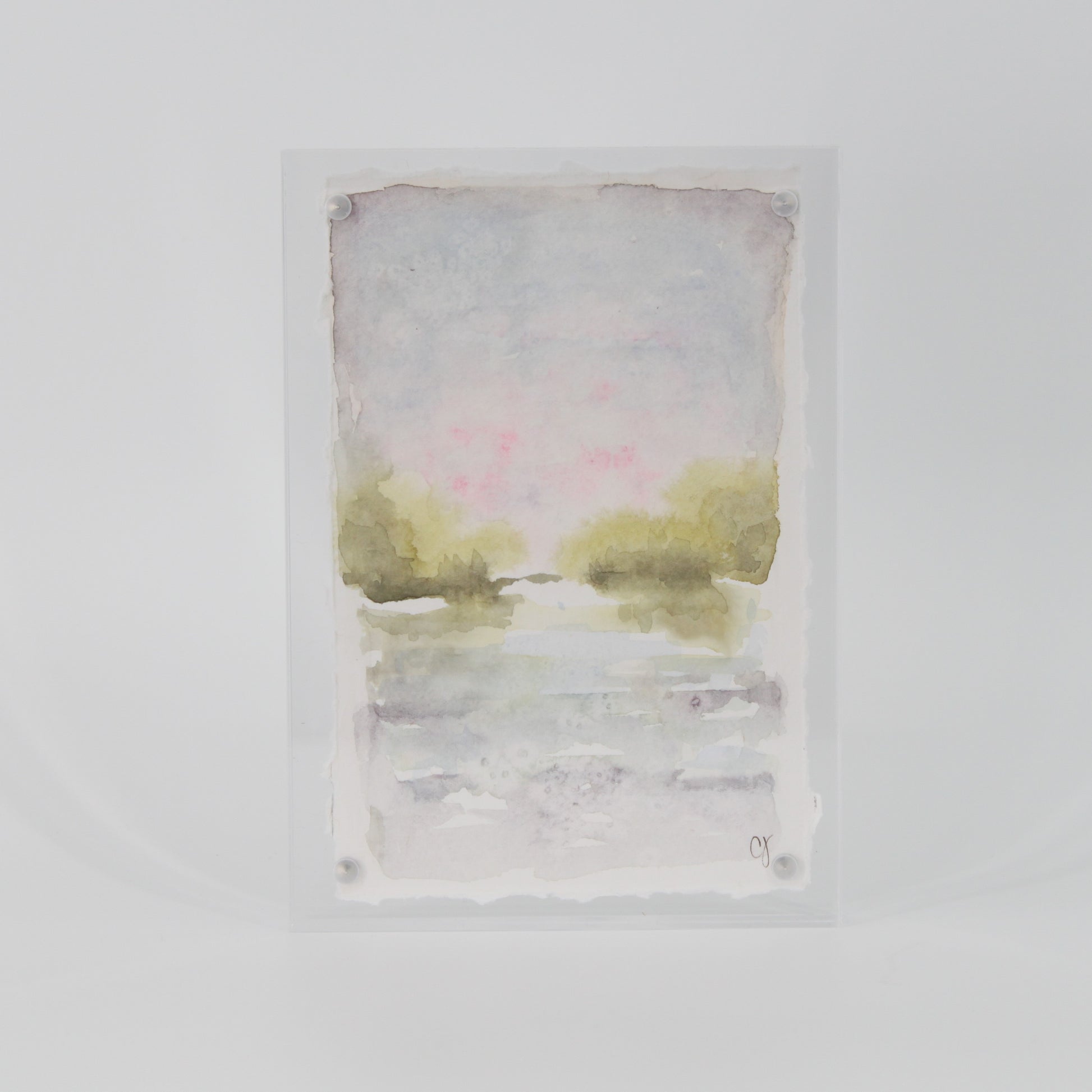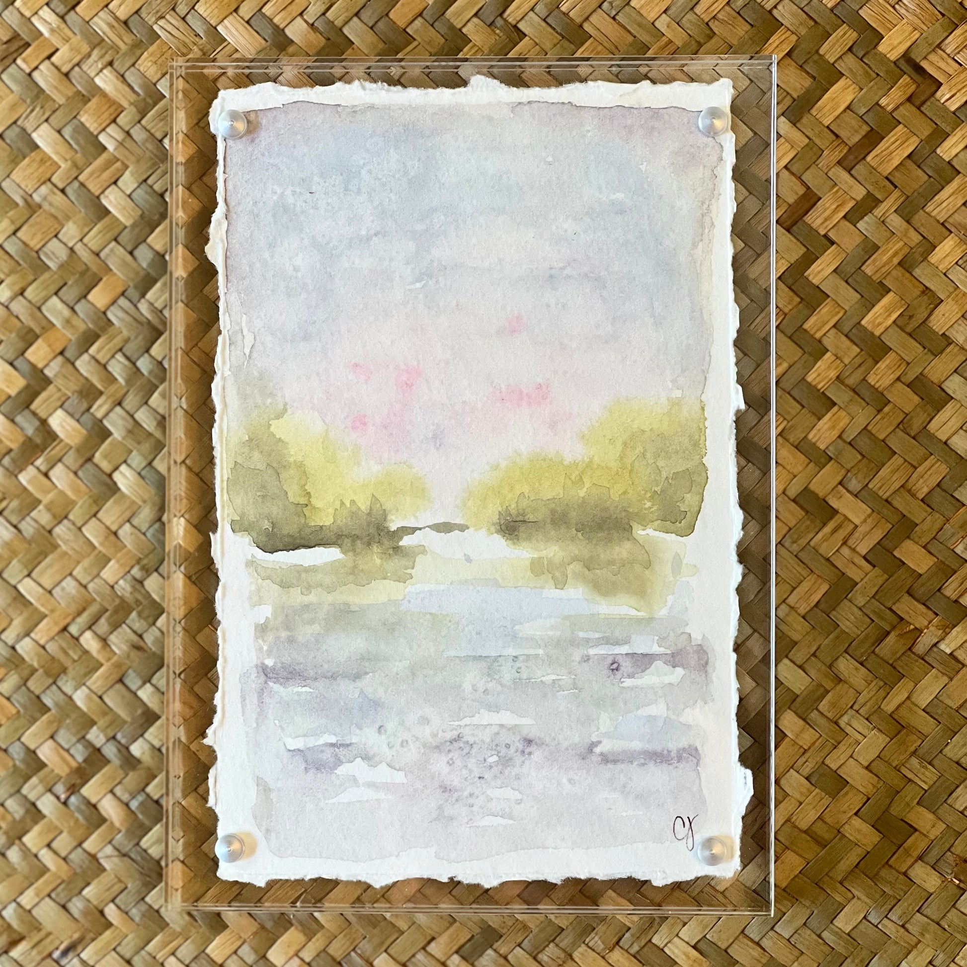 Watercolor landscape artwork is set in an acrylic 5” x 7” acrylic tabletop frame.