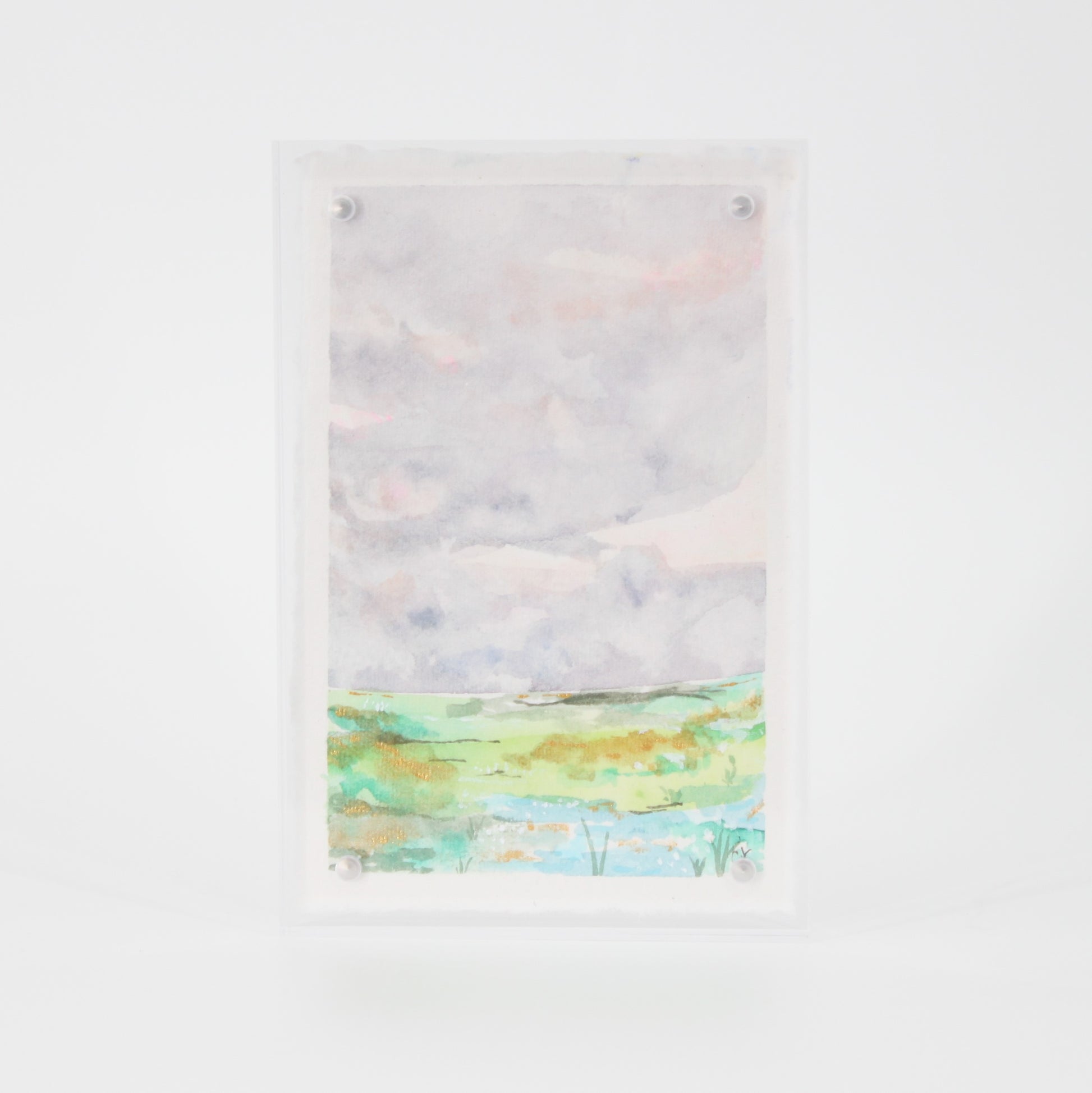 Watercolor landscape artwork measures 4” x 6” on hand torn paper and features gold leaf accents. Artwork is set in an acrylic 4” x 6” frame.