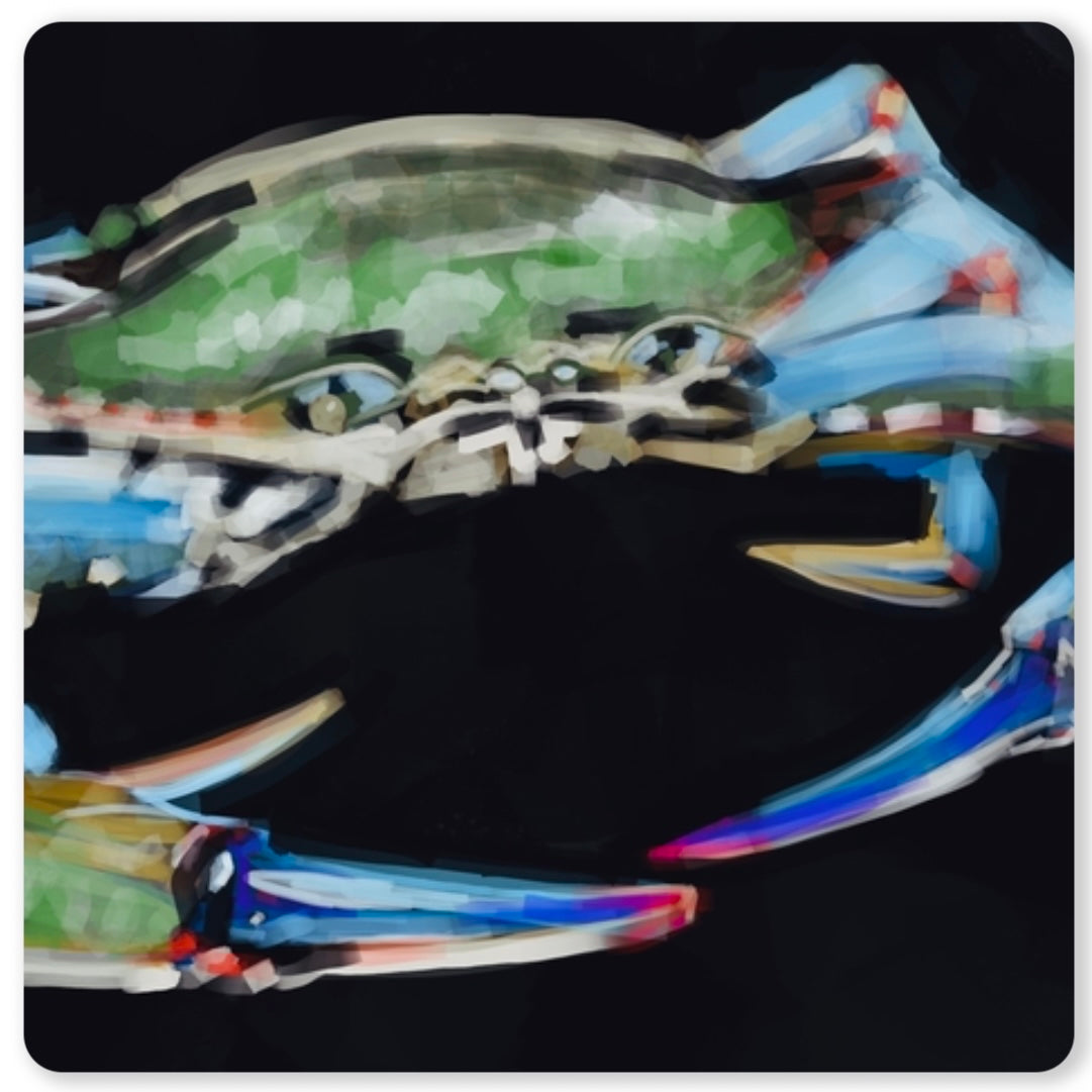 Crab artwork is printed on either 4” round or 3.5” square rubber base coasters. This is a 4 piece coaster set and includes free shipping.