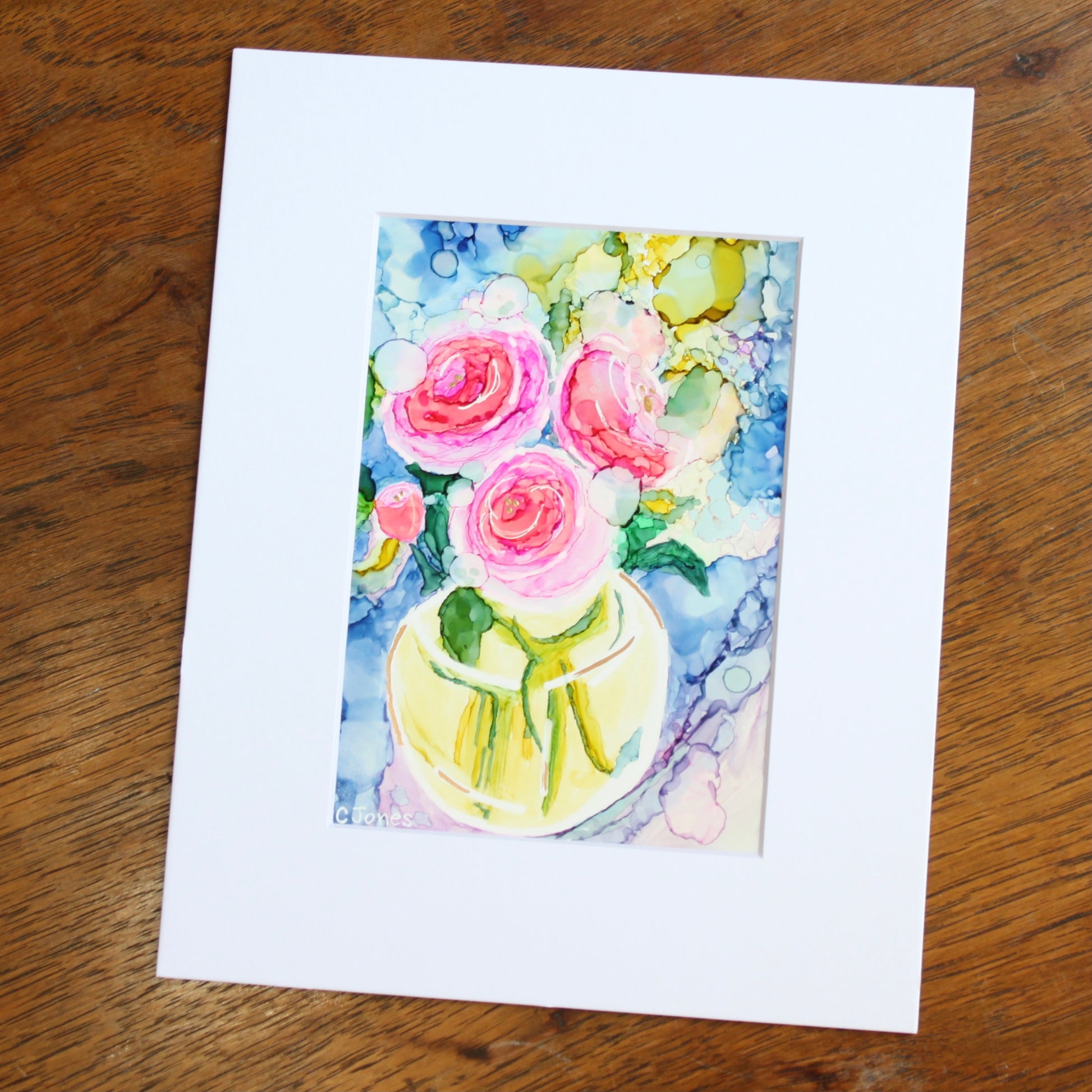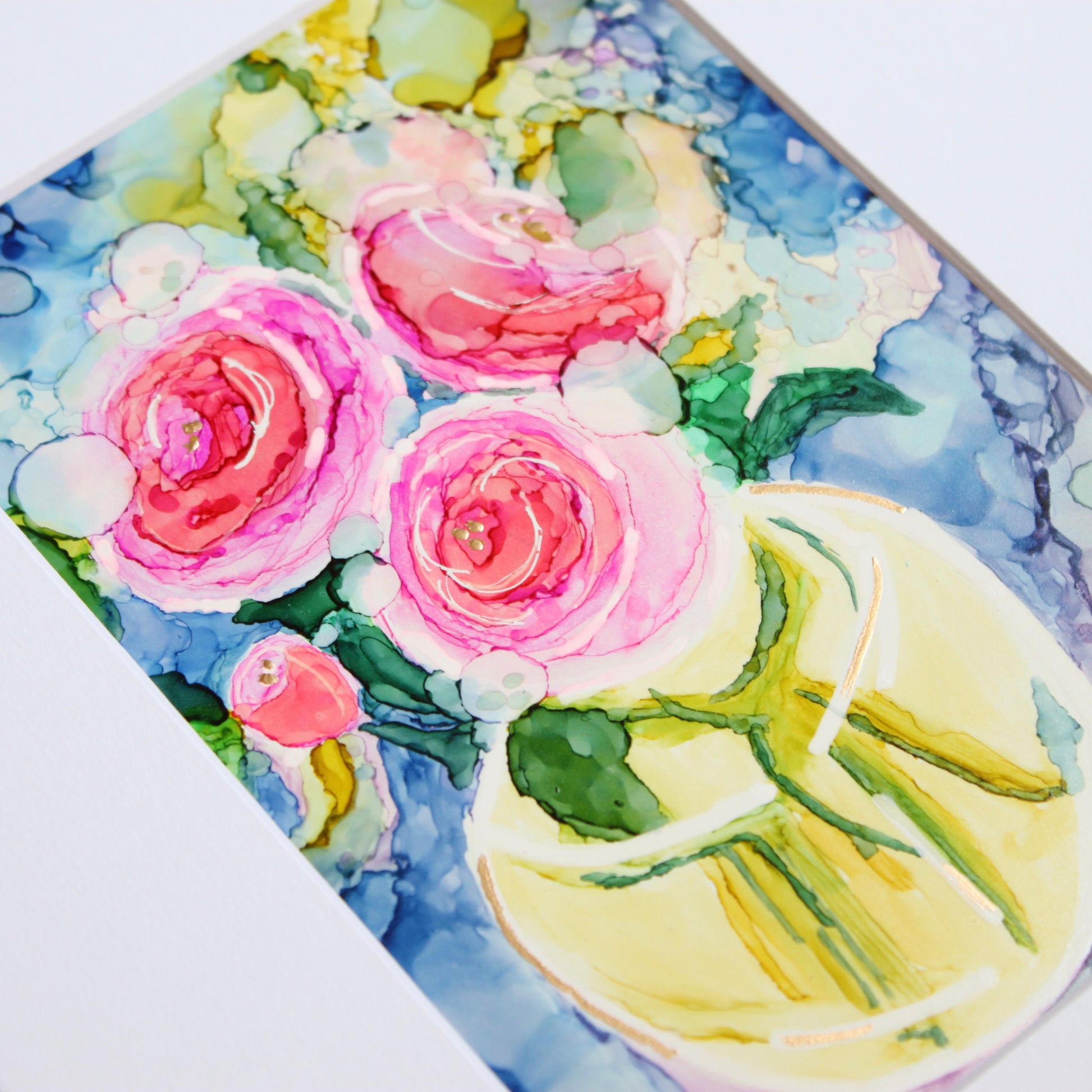 Ink artwork measures 5” x 7” and features gold leaf accents.