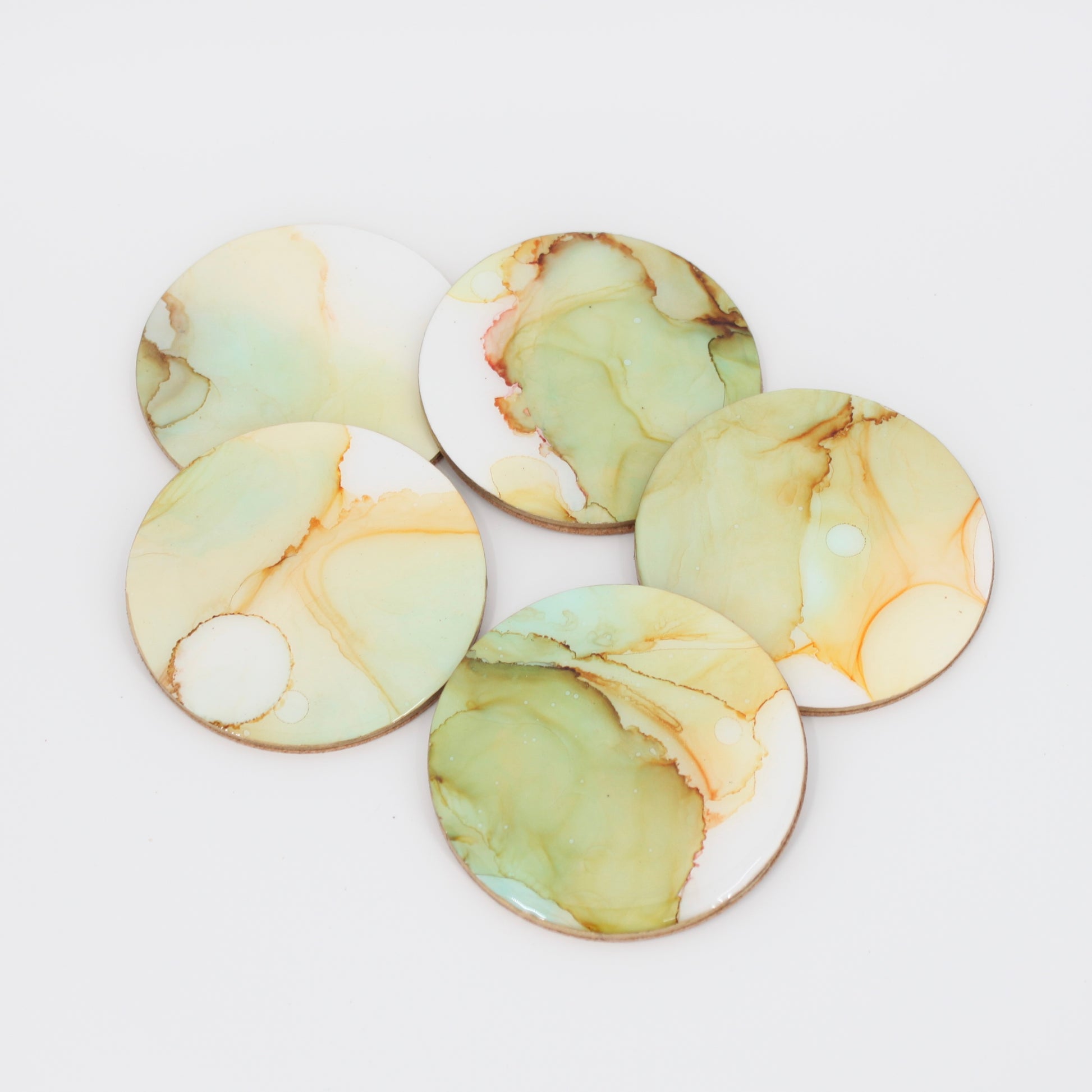 Each coaster has a clear heat protective resin coat for added protection. A cork backing has been added to prevent sliding.